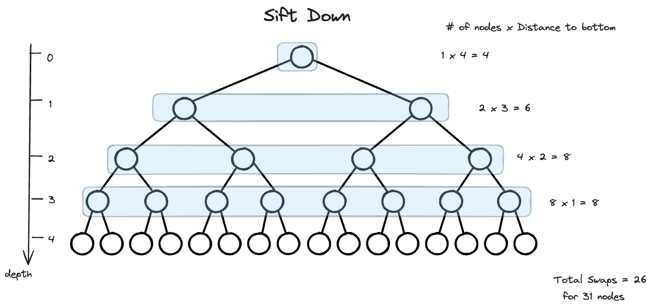 sift down中,每一层的操作数量都满足,当前层的nodes数量和到bottom的距离的乘积. For a heap of size 31, 总计26次操作.