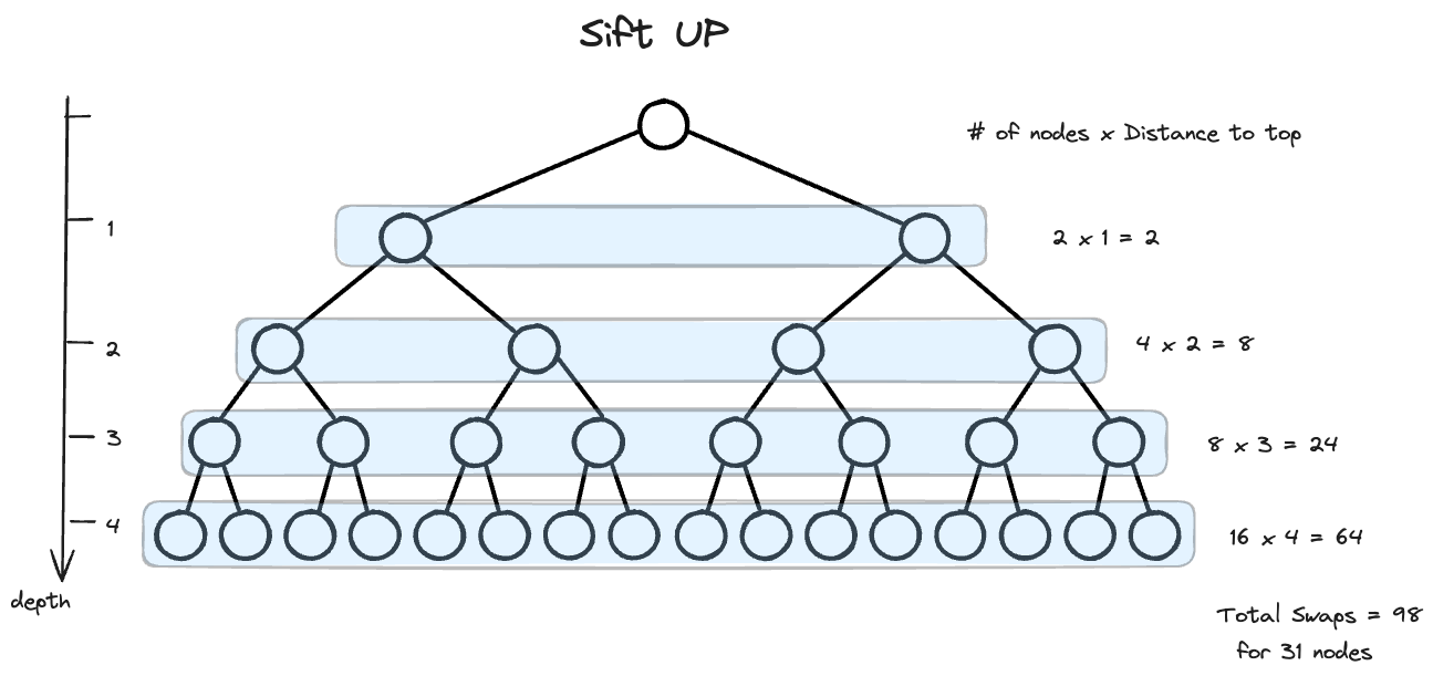 sift up中每一层的操作数量都满足,当前层的nodes数量和到root的距离的乘积. For a heap of size 31, 总计98次操作.