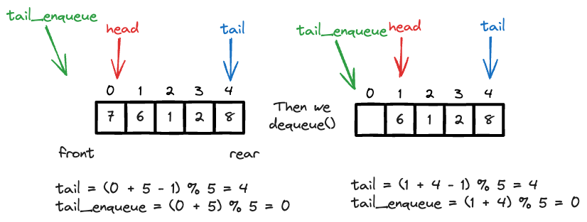 tail = (head + count - 1) % capacity: 指向first available empty slot ready to be enqueuedtail_enqueue = (head + count - 1) % capacity: 指向the last element in the queue (刚刚enqueue进来的).