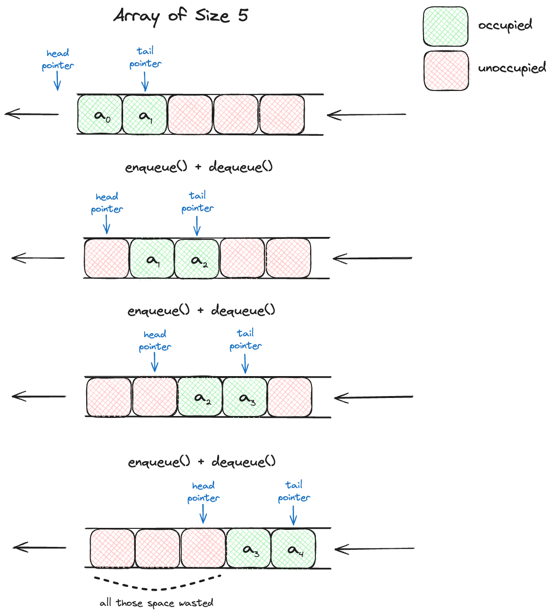 你会发现你的tail pointer已经到了静态array的size limit, 也就是tail = 4 (0-indexed). 如下图所示,