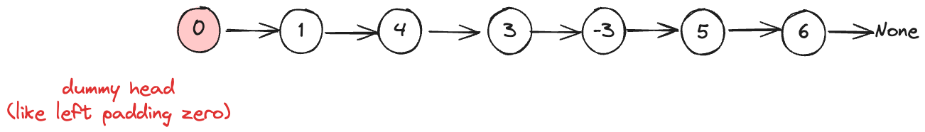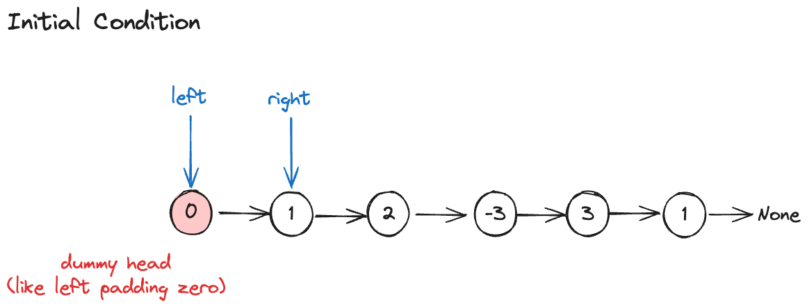 如下图所示, left pointer points at dummy head node, right pointer points at the first node of the linked list.