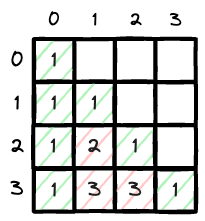 之前说过,可以用一个2d array来存储这个triangle, 而且这些数据都存在lower triangle, 那么我们先找特殊情况,什么时候这个array为1?