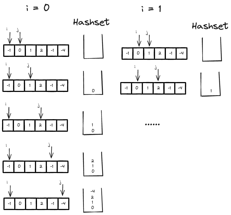 - 第三个index k 是从ranging from i to j的双开区间, 或者说nums[i+1:j]进行选择, 由于我们的i,j都已经确认了,所以我们只需要找到一个k使得nums[i]+nums[j]+nums[k] = 0即可,我们在储存这个incremental记录的时候,只需要储存deduplicated结果即可, 所以需要一个hashset来储存我们的结果, 每次到下一个i的时候,我们需要reset我们的hashset.