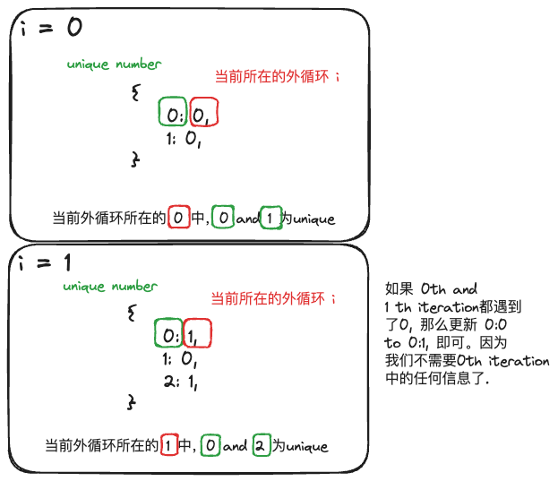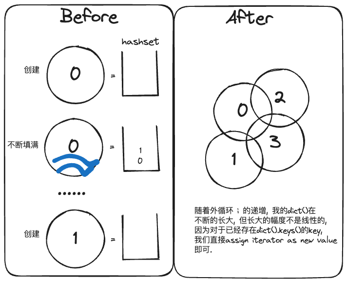 这么做的好处是,不需要每次i变换,都reset hashset, 现在只需要在dict()里,随着i的变化,