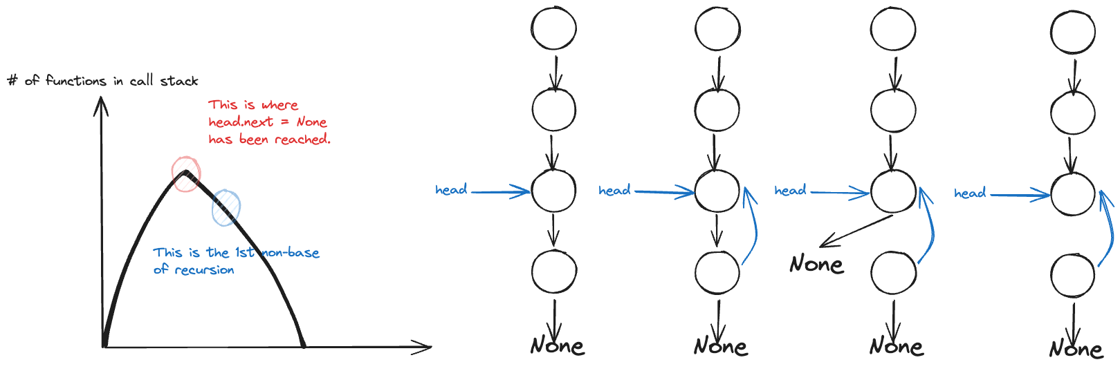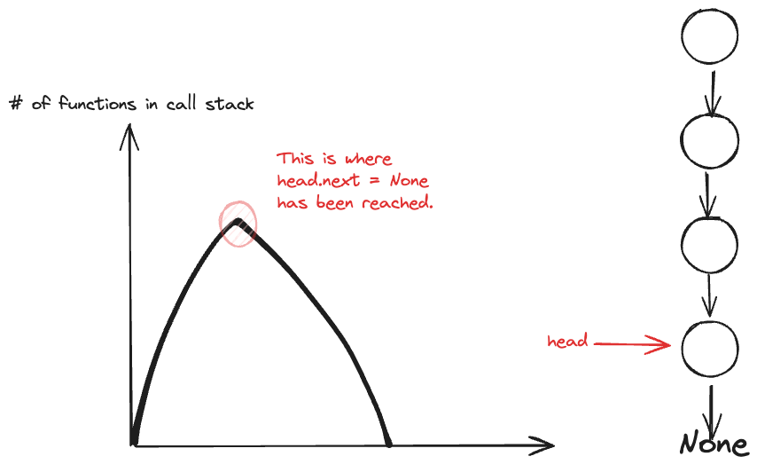如下图所示, 函数不断堆积在call stack里,直到head指向最后一个node,终于满足head.next is None, 开始pop function from stack了