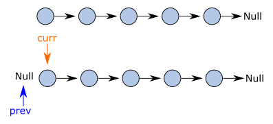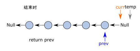 由此直到curr pointer hits null,最后的diagram如下图, 这时候curr points to Null while prev is the new "head" for this reversed list. return prev