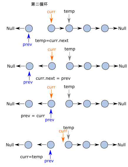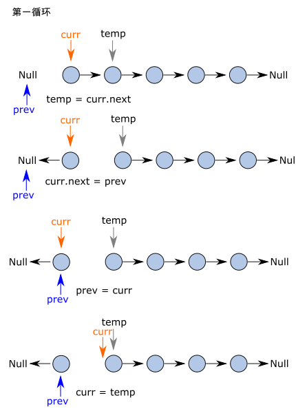 temp = curr.next: create a pointer points to next nodecurr.next = prev: points the current node to the previous node.prev = current: previous pointer advances by one.curr = temp: current pointer advances by one
