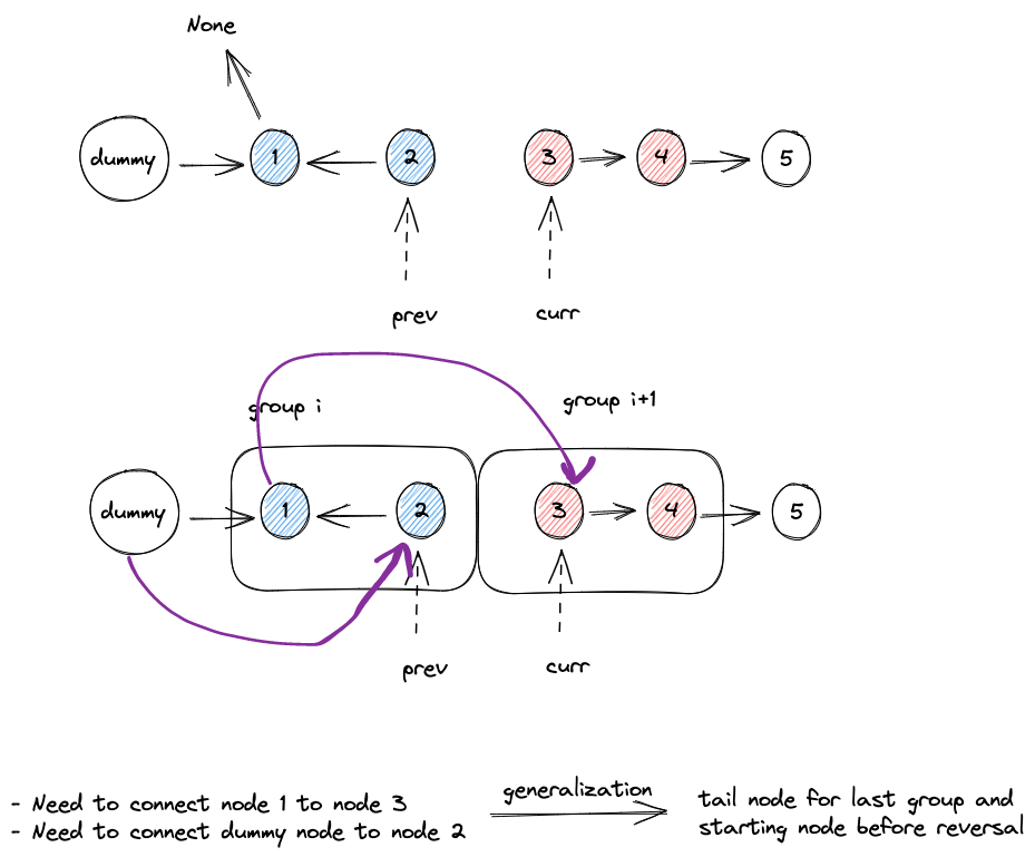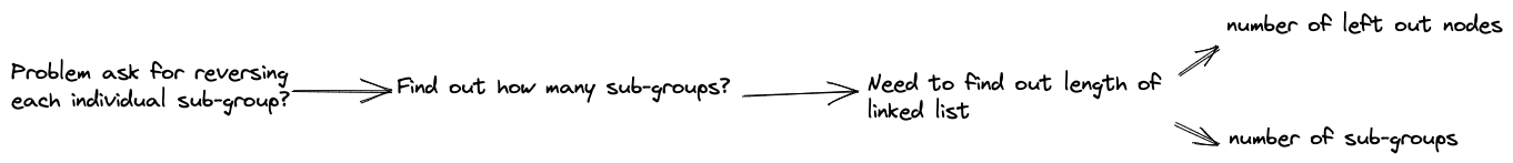 After we determine the linked list length, we could easier get the number of groups and number of left out nodes