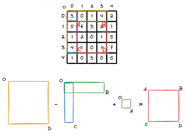 Prefix sum --> 2D的思维扩展, intuition is by inclusion-exclusion,