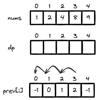 the previous index of the largest divisible subset ending at i element. 这个array的value指向的是上一个index that is divisible by nums[i]