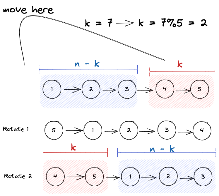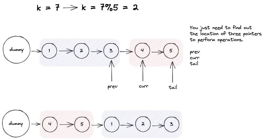 Instead of doing \(k_{real}\) times, we can just do 1 single operation, we just need to find the pattern. 我们知道k and n, 那只需要将整个linked list分为两块即可,