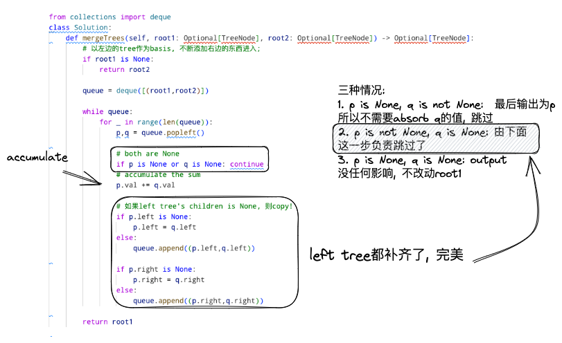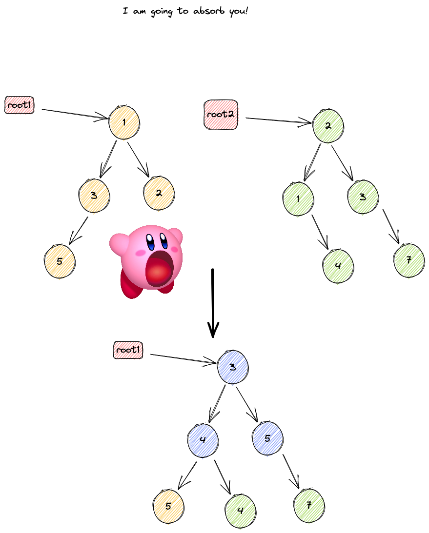 Imagine that when you put one of them to cover the other, some nodes of the two trees are overlapped while the others are not. You need to merge the two trees into a new binary tree. The merge rule is that if two nodes overlap, then sum node values up as the new value of the merged node. Otherwise, the NOT null node will be used as the node of the new tree.