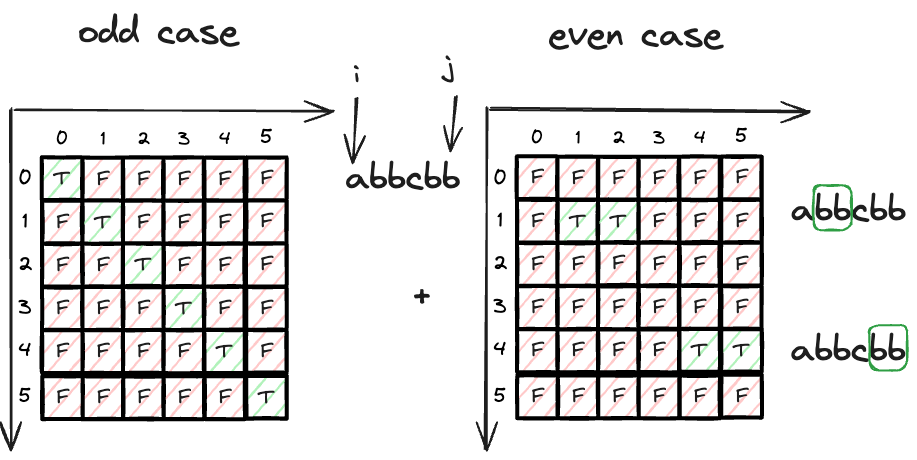 这一题有两个base case, 一个是奇数长度的,一个是偶数长度的, 所以更新由下图所示,