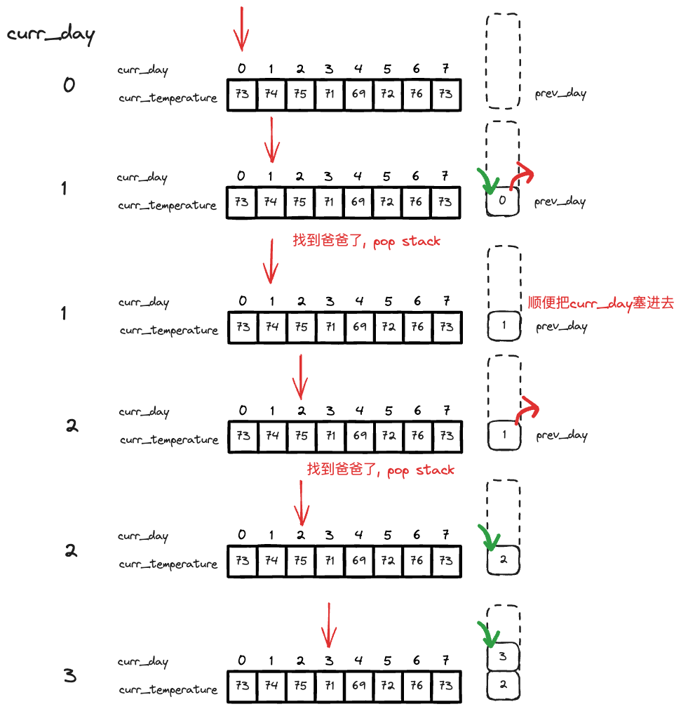stack[-1]所指向的温度比当前温度低,那我们就找到答案了,我们就pop出来,然后记录答案。 - 如果上一个iteration塞进去的,