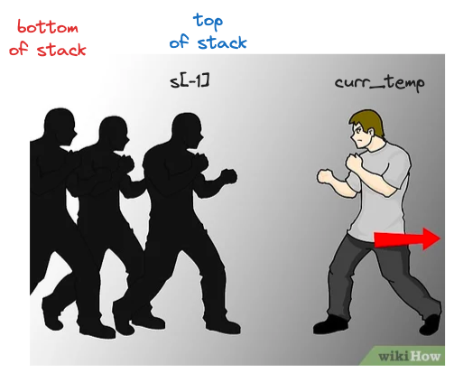 是因为我们是个one-pass solution, 当我们遇到一个新的temp的时候,我们比较curr_temp和top of stack的温度 (在monotonic stack中是最低的,最弱的温度),所以我们需要while loop让curr_temp来打擂台赛,直到输掉.