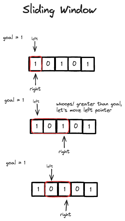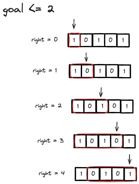 所有以right pointer为结尾,且符合prefix_sum <= goal的subarray的个数,正好等于符合条件的最大window size. 有两个条件: