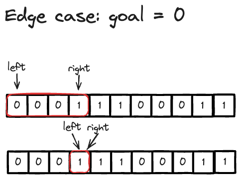 但这里有一个edge case, 当goal = 0时候,当我们right pointer encounter 1的时候,我们开始move left pointer, 结果发现不管怎么移动,subarray sum都是1, 如下图.