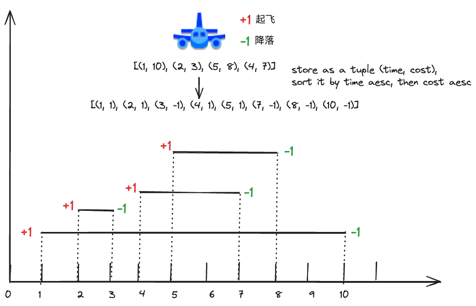 数飞机这个题目就是一个典型的扫描线算法的题目。我们可以把飞机的起飞和降落时间看成是一个interval,然后我们可以把这些interval的所有起飞和降落的时间点按照时间排序。只有这些时间点对空中飞机数量有影响。 扫描线的概念就是从左到右扫描,同时记录下来当前时间点的飞机数量。这样我们就可以得到天上同时最多有多少架飞机了。